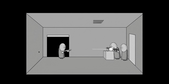 漢克登上電梯頂后電梯停了下來(lái)門一開一堆小兵朝里面開槍但發(fā)現(xiàn)里面沒(méi)有人就進(jìn)去了