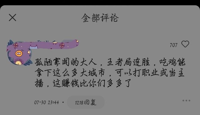 秦予石王者我也能連勝,也能蟬聯(lián)王者,吃雞也能殺出重圍。游戲只是消遣,生活才是最重要的。如果你要用游戲當(dāng)職業(yè),那就不會(huì)像視頻里的一樣了,你會(huì)一直提升自己,電競(jìng),打的不僅僅是輸贏,總有些東西,比輸贏本身更重要。