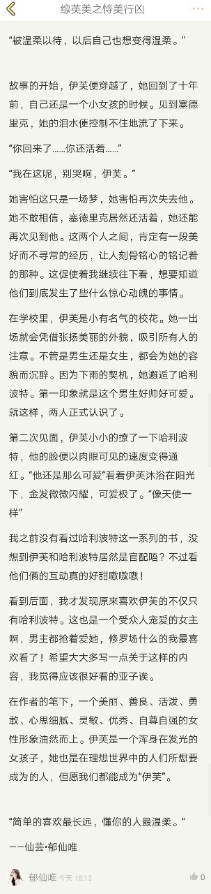 看到后面,我才發(fā)現(xiàn)原來(lái)喜歡伊芙的不僅只有哈利波特。這也是一個(gè)受眾人寵愛(ài)的女主啊,男主都搶著愛(ài)她,修羅場(chǎng)什么的我最喜歡看了!希望大大多寫(xiě)一點(diǎn)關(guān)于這樣的內(nèi)容,我覺(jué)得應(yīng)該很好看的亞子誒。