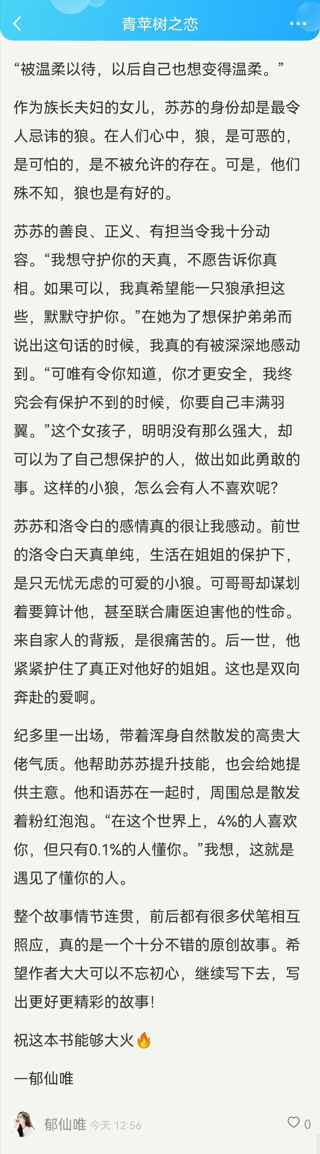 蘇蘇的善良、正義、有擔(dān)當(dāng)令我十分動容?!拔蚁胧刈o(hù)你的天真,不愿告訴你真相。如果可以,我真希望能一只狼承擔(dān)這些,默默守護(hù)你。”在她為了想保護(hù)弟弟而說出這句話的時候,我真的有被深深地感動到?!翱晌ㄓ辛钅阒溃悴鸥踩?,我終究會有保護(hù)不到的時候,你要自己豐滿羽翼?!边@個女孩子,明明沒有那么強(qiáng)大,卻可以為了自己想保護(hù)的人,做出如此勇敢的事。這樣的小狼,怎么會有人不喜歡呢?