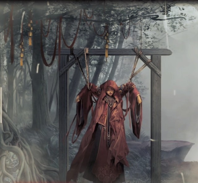 我拖著刀來到吊著一個新娘的祭臺,用刀將阻礙我的樹根砍掉。