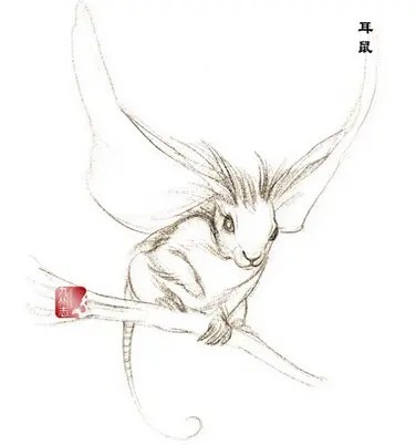 耳鼠是中國神話傳說中的異獸,如鼠,兔頭,能以尾飛,其說始見于先秦?!渡胶=?jīng)》有云:耳鼠,獸,其狀如鼠,而菟首麋身,其音如獆犬,以其尾飛,食之不采,又可以御百毒。