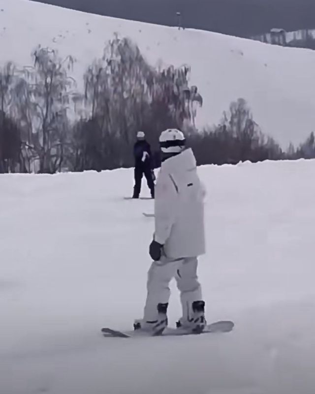 兩人聊著聊著就睡著了。第二天早上八點(diǎn)左右兩人都起床洗漱好后準(zhǔn)備去滑雪場(chǎng)了,他們?nèi)サ氖切陆募似樟只﹫?chǎng)地。兩人還穿著滑雪服,拿著滑雪板一起拍了照。