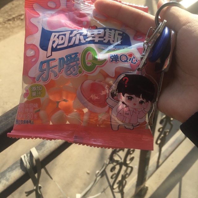 顧簡依就上次那個超市啊,我買零食看見了,一個你手上這個兔子形草莓軟糖,一個小馬形狀茄子味餅干兒