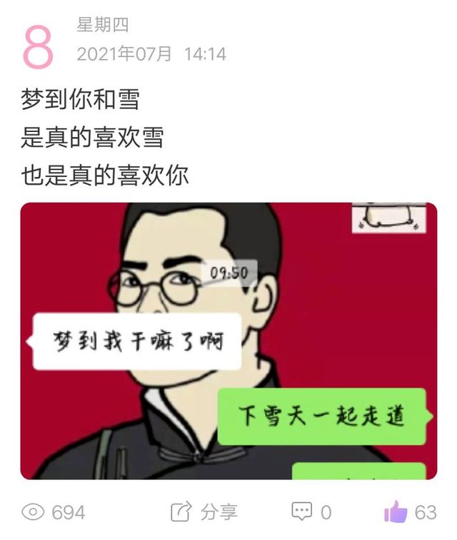 七號(hào)晚上夢(mèng)到他了,在學(xué)校,下雪了,他給我撐著傘。