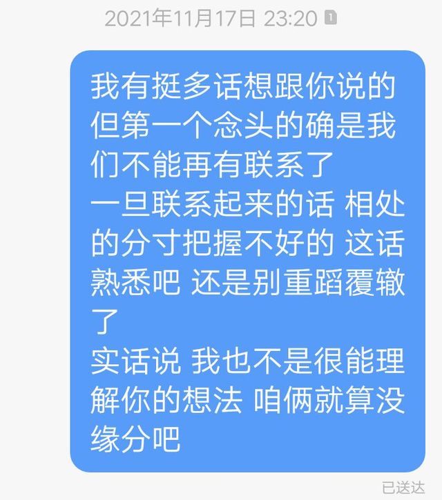 我有挺多話想跟你說的,我的第一想法的的卻卻是我們不能再有聯(lián)系了。實(shí)話說,我不理解你的想法,咱算沒緣分吧,你好好處你的對象。