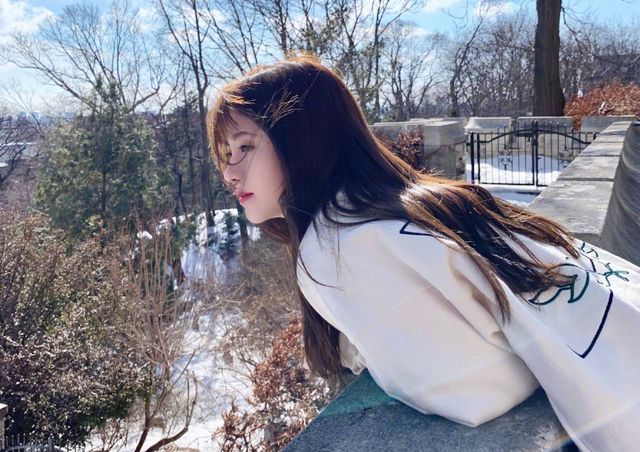 女孩站在陽臺(tái)看著樓下的雪