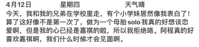 而是一本薄薄的日記本,上面寫的都是作者的日常。那可愛的語言,每一次都會讓他期待這個粉絲下一次日記。他會給自己分享他的所有開心有時會有一些不開心的事情,每本日記馬嘉祺都會放好。