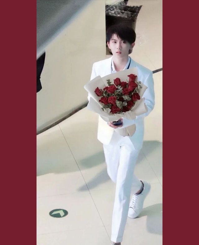馬嘉祺身穿白色西服,手拿紅玫瑰向著夏曦曦走了過來(lái)