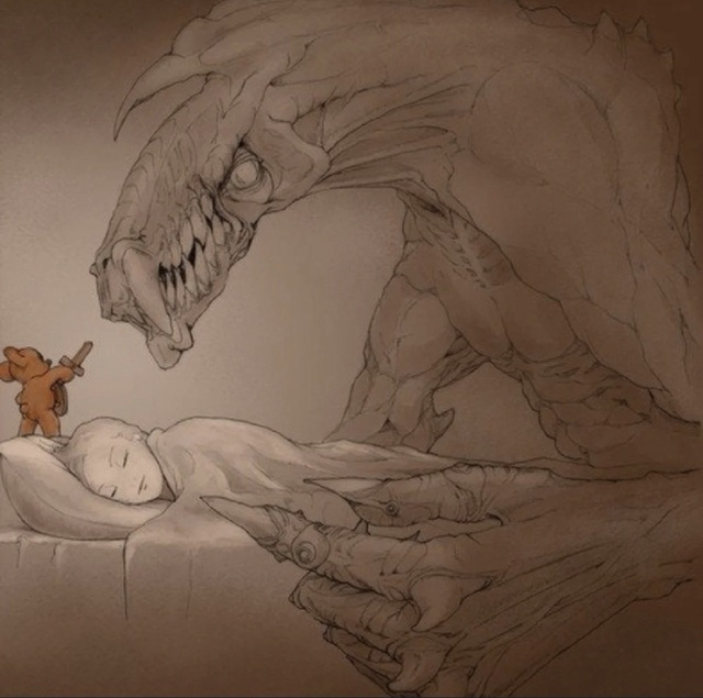 男孩的枕邊的小熊似乎變成了戰(zhàn)士,驅(qū)趕著少年夢(mèng)里的那些妖魔鬼怪,守護(hù)著少年的夢(mèng)