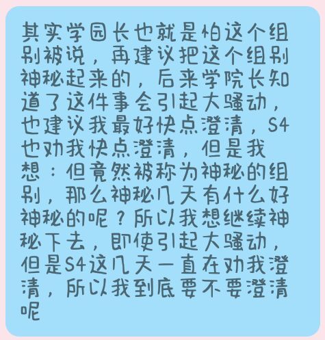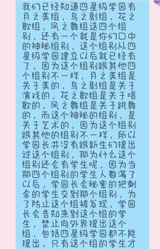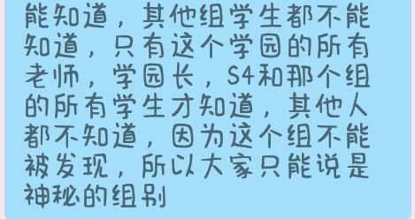 星野蕓因為我已經(jīng)找學(xué)園長談過了,學(xué)園長允許我說,我才說的,事情真相已經(jīng)露出來了,你們不會再說神秘的組別了吧?