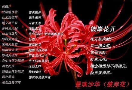 宋詩(shī)雨相傳以前有兩個(gè)人名字分別叫做彼和岸,上天規(guī)定他們兩個(gè)永不能相見(jiàn)。他們心心相惜,互相傾慕,終于有一天,他們不顧上天的規(guī)定,偷偷相見(jiàn)。正所謂心有靈犀一點(diǎn)通,他們見(jiàn)面后,彼發(fā)現(xiàn)岸是一個(gè)貌美如花的女子,而岸也同樣發(fā)現(xiàn)彼是個(gè)英俊瀟灑的青年,他們一見(jiàn)如故,心生愛(ài)念,便結(jié)下了百年之好,決定生生世世永遠(yuǎn)廝守在一起。 結(jié)果是注定的,因?yàn)檫`反天條,這段感情最終被無(wú)情的扼殺了。天庭降下懲罰,給他們兩個(gè)下了一個(gè)狠毒無(wú)比的詛咒,既然他們不顧天條要私會(huì),便讓他們變成一株花的花朵和葉子,只是這花奇特非常,有花不見(jiàn)葉,葉生不見(jiàn)花,生生世世,花葉兩相錯(cuò)。 傳說(shuō)輪回?zé)o數(shù)后,有一天佛來(lái)到這里,看見(jiàn)地上一株花氣度非凡,妖紅似火,佛便來(lái)到它前面仔細(xì)觀看,只一看便看出了其中的奧秘。佛既不悲傷,也不憤怒,他突然仰天長(zhǎng)笑三聲,伸手把這花從地上給拔了出來(lái)。佛把花放在手里,感慨的說(shuō)道:“前世你們相念不得相見(jiàn),無(wú)數(shù)輪回后,相愛(ài)不得廝守,所謂分分合合不過(guò)是緣生緣滅,你身上有天庭的詛咒,讓你們緣盡卻不散,緣滅卻不分,我不能幫你解開(kāi)這狠毒的咒語(yǔ),便帶你去那彼岸,讓你在那花開(kāi)遍野吧。 佛在去彼岸的途中,路過(guò)地府里的三途河,不小心被河水打濕了衣服,而那里正放著佛帶著的這株紅花,等佛來(lái)到彼岸解開(kāi)衣服包著的花再看時(shí),發(fā)現(xiàn)火紅的花朵已經(jīng)變做純白,佛沉思片刻,大笑云:大喜不若大悲,銘記不如忘記,是是非非,怎么能分得掉呢,好花,好花呀。佛將這花種在彼岸,叫它曼馱羅花,又因其在彼岸,叫它彼岸花。 可是佛不知道,他在三途河上,被河水褪色得花把所有得紅色滴在了河水里,終日哀號(hào)不斷,令人聞之哀傷,地藏菩薩神通非常,得知曼馱羅已生,便來(lái)到河邊,拿出一粒種子丟進(jìn)河里,不一會(huì),一朵紅艷更勝之前的花朵從水中長(zhǎng)出,地藏將它拿到手里,嘆到:你脫身而去,得大自在,為何要把這無(wú)邊的恨意留在本已苦海無(wú)邊的地獄里呢?我讓你做個(gè)接引使者,指引他們走向輪回,就記住你這一個(gè)色彩吧,彼岸已有曼馱羅,就叫你曼沙珠華吧。 從此,天下間就有了兩種完全不同的彼岸花,一個(gè)長(zhǎng)在彼岸,一個(gè)生在三途河邊。話說(shuō)又過(guò)了很多年,天下有兩個(gè)很相愛(ài)的人,可是有一年,男的在出外辦事的時(shí)候不幸遇難了,他來(lái)到三途河邊,看見(jiàn)滿眼的血紅,心里哀傷無(wú)比,他痛哭道:“我不要輪回,我要回去找我的妻子,她還在家里等我?!彼沧驳膩?lái)到孟婆這里,喝下忘情湯前,他問(wèn)孟婆,為何天下諸般,最后這湯獨(dú)要人忘情。孟婆笑而不語(yǔ),只是要他快喝,他呆呆的看著湯,說(shuō):“人都要忘情,我偏不忘,輪回后,我要去找我的妻子?!? 男人的妻子得知他的死訊后,悲痛絕倫,幾度尋死都被男子的家人救了下來(lái),最后女子答應(yīng)不再輕生,但是要終生守寡。男子的家人一來(lái)看她性格剛烈,怕舊事重提,又要徒惹她傷心,二來(lái)念她有心,便暫時(shí)答應(yīng)了她,等她情緒穩(wěn)定后再勸她改嫁不遲。就這樣,女人便在男子家繼續(xù)住了下來(lái),靠縫補(bǔ)為生。 又說(shuō)這男子輪回后,還真重新生在他和女子一起生活的小鎮(zhèn)里,光陰飛逝,不知不覺(jué)二十年過(guò)去了,一天他出門(mén)經(jīng)過(guò)女子守寡的門(mén)前,感覺(jué)到心里怪怪的,便停下來(lái)看了一眼,這一看不要緊,剛好被女子迎面看見(jiàn)。輪回后,這男子的相貌氣質(zhì)均已完全變了,可是女子一看見(jiàn)他,眼淚就嘩嘩的流了下來(lái),她走到男子面前,說(shuō)了一句:“你來(lái)找我了?!北慊璧乖诘?。男子一看一個(gè)素不相識(shí)的老女人倒在自己面前,趕忙嚇的逃離了那個(gè)地方。 后來(lái)這個(gè)女的重病不起,到死前翻來(lái)覆去的說(shuō)什么,但是聲音太小,沒(méi)有人聽(tīng)清楚過(guò),所以也沒(méi)有在意,這女子最后滴下兩行血淚,一命嗚呼了。女子來(lái)到地府,看見(jiàn)孟婆,突然很輕的問(wèn)她:“老婆婆,以前是不是有個(gè)男子在這里告訴你,他不會(huì)忘記我,一定會(huì)回來(lái)找我?”孟婆點(diǎn)點(diǎn)頭。女子心疼非常,哽咽道:“那為何他回來(lái)卻不肯認(rèn)我,哪怕他跟我說(shuō)句話,在我臨死前來(lái)看看我也好呀?!泵掀排呐乃募绨?,說(shuō):“你們很相愛(ài),我很欣賞你們的勇氣,這樣吧,二十年后答案來(lái)臨那一刻,我答應(yīng)讓你看看,只是這之前你無(wú)法轉(zhuǎn)世,要在這里受苦二十年,你愿意嗎?”女子說(shuō):“我愿意,不看見(jiàn)那個(gè)答案,我放不下對(duì)他的愛(ài),即使投胎轉(zhuǎn)世,也要心痛一世?!边@女子于是被孟婆安排給彼岸花鋤草,其實(shí)本無(wú)草可鋤,但是女子的眼里滿岸是草,鋤了又生,永遠(yuǎn)鋤不完,就這么日復(fù)一日,年復(fù)一年。