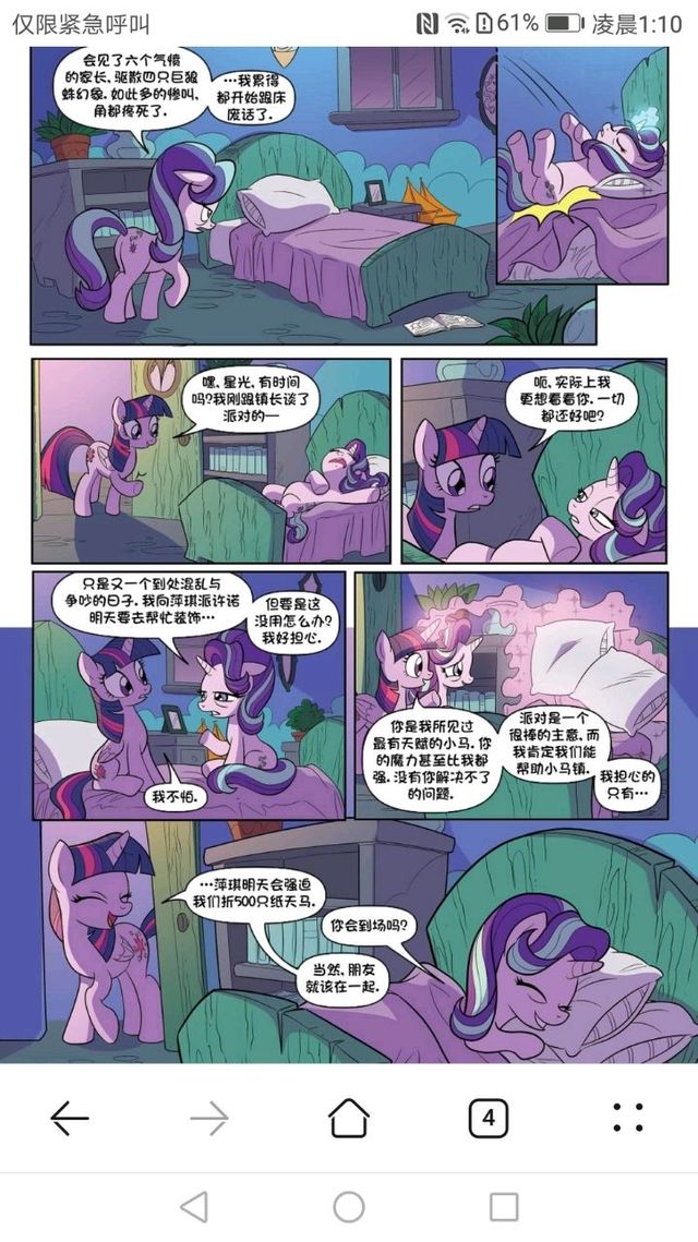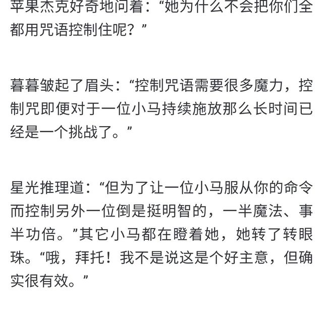 有說(shuō)法是星光暴怒狀態(tài)下才能勉強(qiáng)和暮光一戰(zhàn),我覺(jué)得也不夠客觀。常態(tài)下的星光表現(xiàn)其實(shí)也是相當(dāng)亮眼的,在修復(fù)水晶愛(ài)心和對(duì)抗暗影之馬時(shí),她的表現(xiàn)并不比公主們要差。在官方小說(shuō)和邪惡女巫的戰(zhàn)斗中,面對(duì)擁有大公主級(jí)別攻擊力的女巫,她能不落下風(fēng)并帶領(lǐng)CMC還有傷員撤退;而設(shè)定上會(huì)讓施咒者耗費(fèi)大量魔力的控制咒,她也能輕松在正劇里使用,并且是一次控制五位小馬。包括官方多次對(duì)她們二馬魔力的評(píng)價(jià),我覺(jué)得可以說(shuō)明常態(tài)的她表現(xiàn)并不弱于暮光。